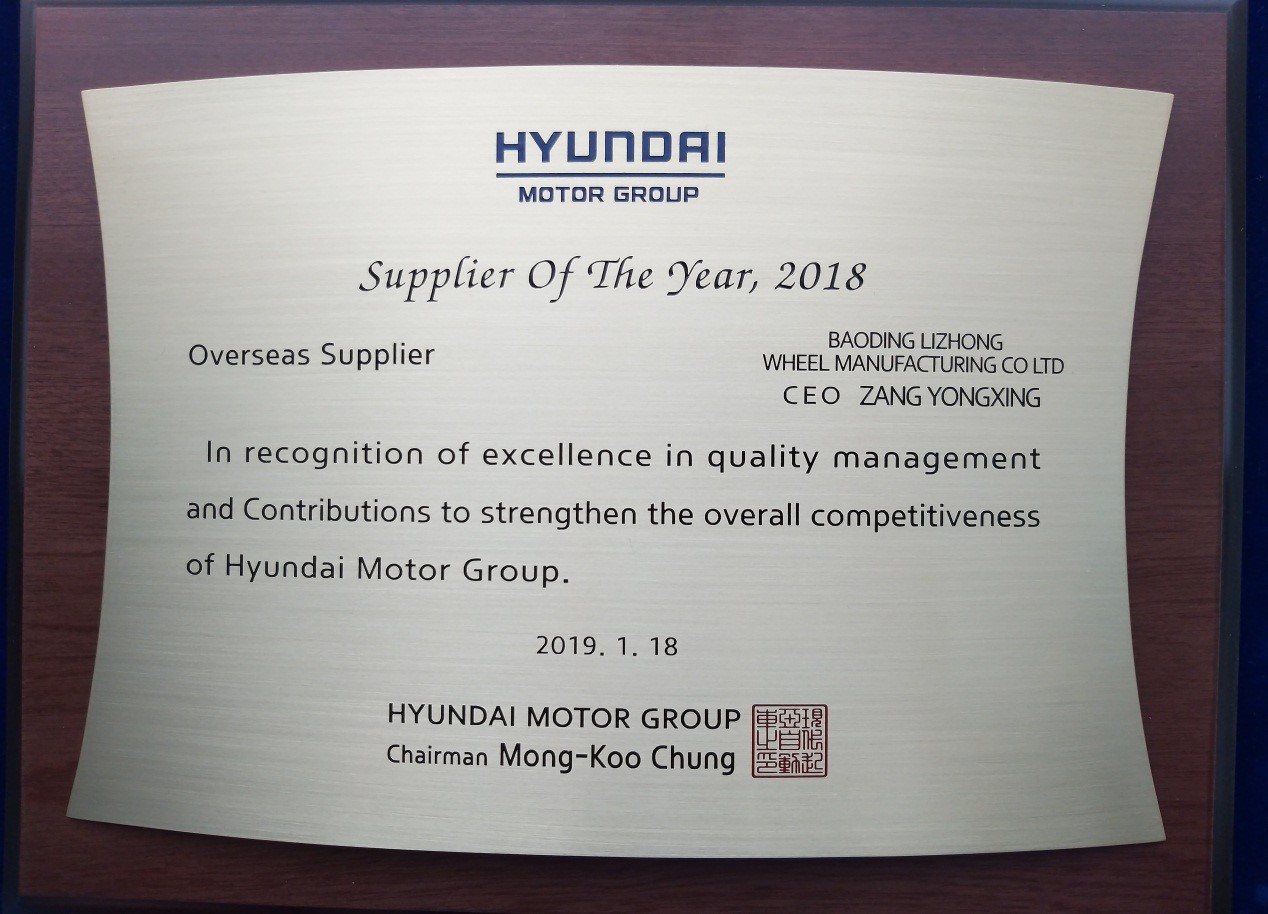 2019年1月,現(xiàn)代起亞汽車集團(tuán)授予保定市立中車輪制造有限公司“優(yōu)秀供應(yīng)商”獎(jiǎng)項(xiàng)并頒發(fā)證書。集團(tuán)總裁張建良先生作為集團(tuán)代表出席了大會(huì)并接受頒獎(jiǎng)。 此獎(jiǎng)項(xiàng)是現(xiàn)代起亞汽車集團(tuán)對(duì)供應(yīng)商開發(fā)能力、交付能力及品質(zhì)保證的全面認(rèn)可,意義非凡。